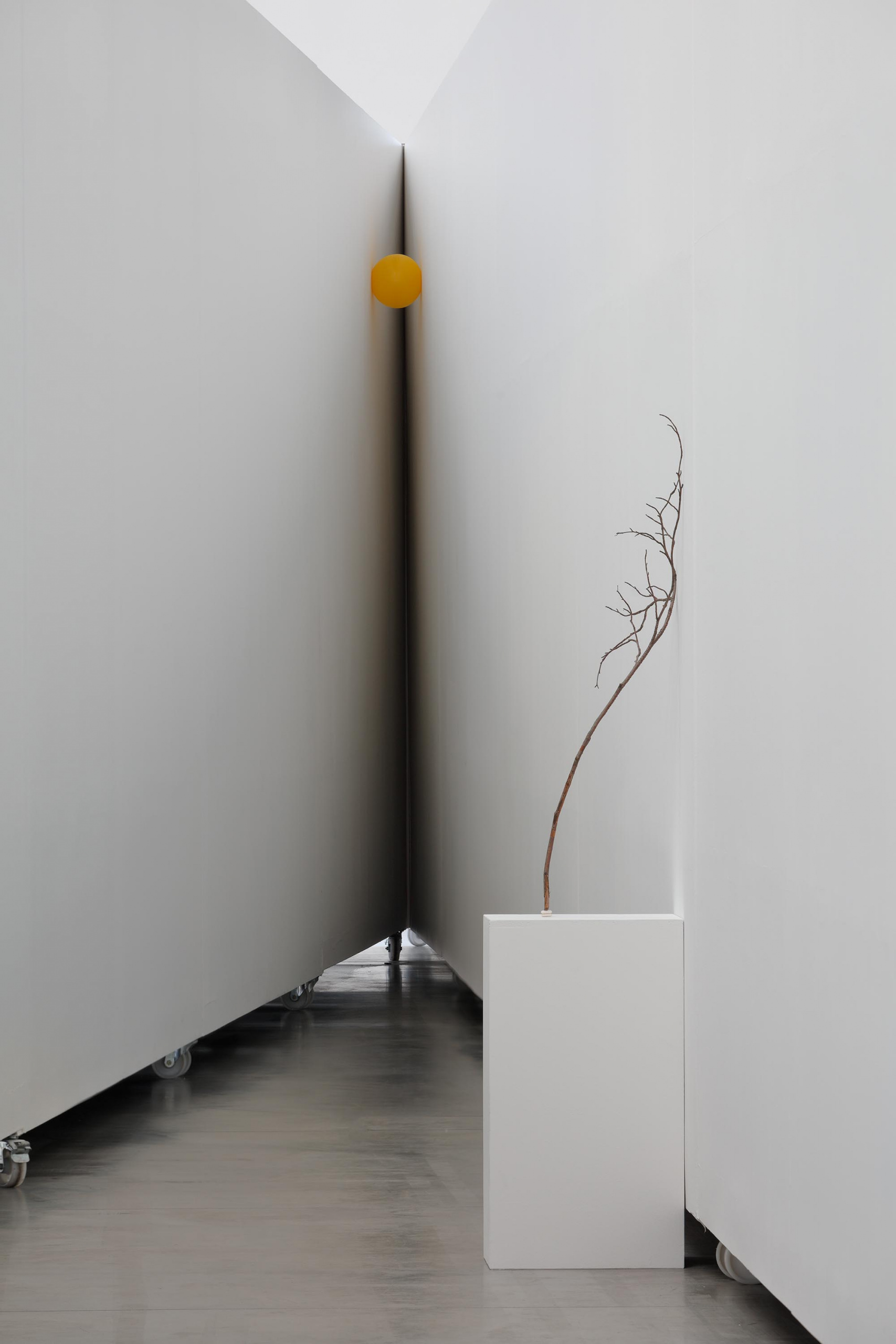 Kovanda’s actions frequently involved banal situations, ordinary activities and mundane tasks that we do automatically, yet acted out in a shifted context. Likewise, in his installations and interventions the artist shifts ordinary, routinely used objects to a completely new, unexpected level by removing them from their original situation and taking away their primary utility function.[2] Thanks to his work in the National Gallery depository[3] Jiří Kovanda first started to use in his installations material related to installation practice in the everyday gallery run, for example strings, paper, glass and wooden wedges. He also employs things of daily use and household objects including foods in his current installations and interventions, along with objects typical of a particular place[4]. Through them he makes a space more visible and defines its individual parts, and thus also slightly manipulatively determines how a particular space and its layout is perceived by viewers and sets a new manner of movement in this space. Jiří Kovanda’s installations are not rooted in an idea of a certain place suitable for or adjustable to a particular work; instead, he executes an idea and the preparation of a situation which is to make up the base of a new project, or of the employment of some of his older works, directly on the spot. This is also the case with the central installation Gold Ring which, perhaps most of all the works on display, prompts a reflection of values, in a metaphorical comparison of a string and a ring, an ordinary thing and an exceptional object. Everything has the same value, all depends on context and interpretation.